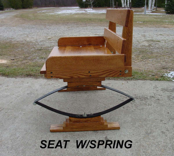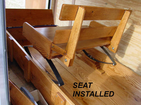 The seat required a little more homework. I made a trip to see a local Amish buggy maker. He sold me a set of buggy seat leaf springs. While there, I gained valuable knowledge that can be used on my next buckboard-building project. Too bad I didn’t pay him a visit sooner. The springs were built up with wood on top and bottom side, and bolted on. The bottom fits just between the sideboards and is secured in place to the bed.