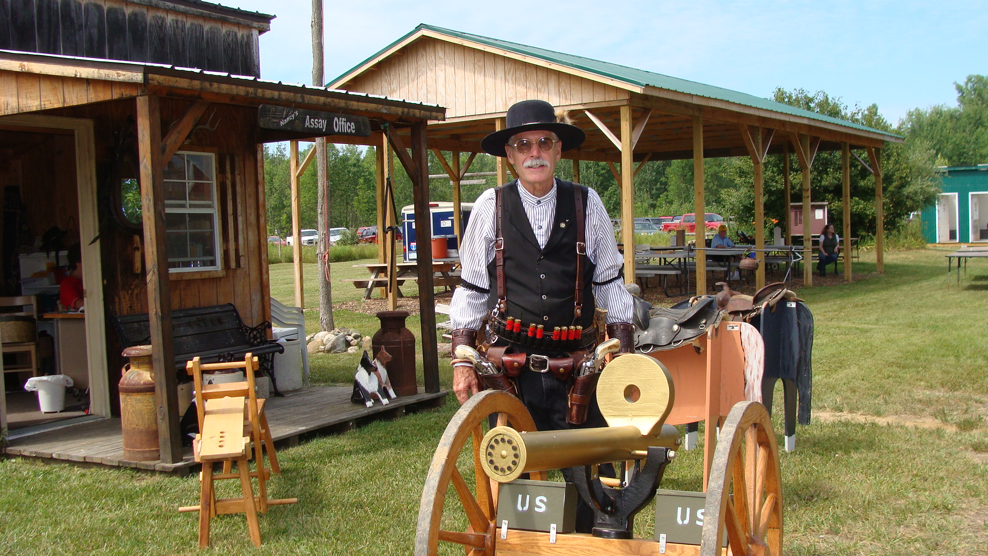 | Riverview Rattler and The Vicar's Wife taking care of the scores. The Vicar's Wife is our secretary & runs our "steam driven" computer that determines the outcome of the match. | Our club has several permanent stages. The Sucker Creek Community Church was one of the first to be built. |