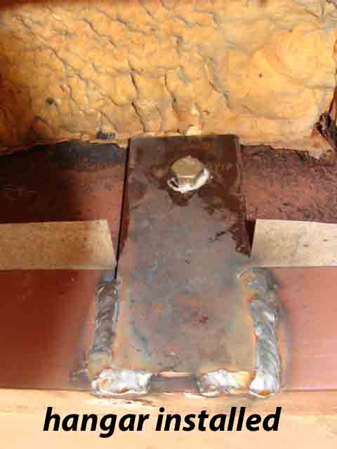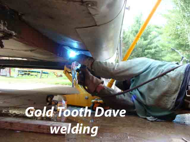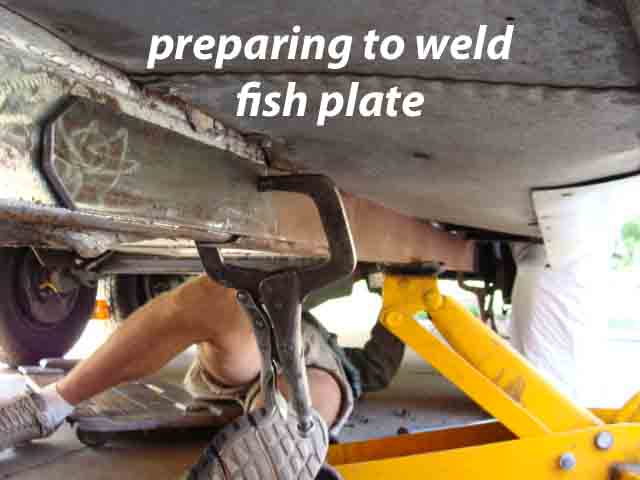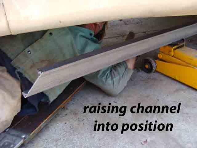 I bought a length of 3” standard channel iron. The original frame is “C” channel made out of what looked like 10 gauge steel around 5 inches high. We cut open the aluminum under belly around 18 inches deep (cross ways to trailer) and 30 inches long (running with trailer length) right behind the rear wheels. Upon inspection the frame was bent on both sides right behind plate that holds the axles in place. We jacked up the rear frame on both sides and set it on jack stands to the point that it was pushed up in place. The measurements were taken between the axle plate and 3” channel that is welded onto the bottom of the original frame at the back of the trailer. The 3” standard channel was cut to match the angle at the back and overlap the axle plate in the front, around 9”. Then two 1/2" holes were drilled in the axle plate and channel on the front and bolted in place. A 1/4" by 3” by 24” fish plate was welded on the back to connect the 3” standard channel to the existing 3” channel. Then a floor jack was used to push the 3” channel up to the trailer frame and two 1/4” by 3” by 7” steel hangers were placed evenly on each side. They have a 1/2" hole in the top and are bolted to the original trailer frame. The bottom was welded to the new piece of 3” channel. Silicone caulk was placed behind the tops of the hangers where they are bolted onto the trailer frame. The channel was bolted and welded to the axle plate. Some type of lock tight should be used on all bolts and nuts. CAUTION: There is foam insulation above the frame that can catch on fire. We wetted it down and had adequate fire protection available.
