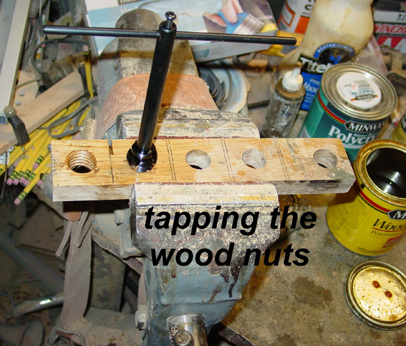 I made the treadle frame sides out of maple. They are full 1” x 3” x 31” long. A 7/8” hole was drilled through the 3” side up 15” from the bottom of each. Then a piece of 3/4" copper pipe was inserted as a bushing for the metal threaded rod to ride on. A 1” hole was drilled through up around 2” from the bottom of each for the foot bar. A 1” wood dowel was used for the bar. It was built up between the treadle sides to hold it in place. The foot bar extends 5” to 6” outside the frame sides. A 1” hole was drilled through up around 8” to 9” from the bottom and also around 2” from the top of each side. Two 1” wood dowels (cut around 2 1/2” longer than the outside width of the treadle) were threaded on each end with a 1” wood threading die. These I used for treadle cross ties which give it extra strength. One-inch wood flat washers and one-inch wood nuts hold them in place. Three quarter inch wood flat washers and wood nuts were made for the metal threaded rod. White Oak or Ash works well for wood washers and nuts. Hole saws were used to make the wood flat washers. A wood threading tap & die set was used to thread the 1” nuts and dowels. A 3/4-10 tap was used to cut threads in the wood nuts for the threaded rod. I got the wood threading taps and dies from www.grizzly.com. Next improvements were made on the horse. First: Instead of drilling one set of holes to install the yoke, I drilled a set of six holes of 1/2" diameter on 1-1/2” centers. This allows the yoke (a piece of 2” x 3” x the inside width of the treadle) to be moved up or down as per the thickness of the work piece while maintaining the angle of the work surface board. The yoke has a 90° V-notch cut in the center of one of the 2”sides. The notch is around 1” deep; this accommodates working on wood spokes and such. The yoke is held in place by two 1/2" by 3” lag screws. A piece of leather or rubber placed on the yoke and/or work surface board helps to keep work from slipping when burnishing occurs.