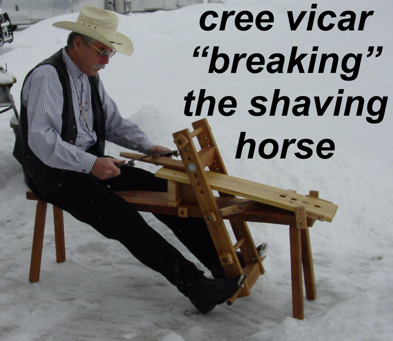 There were many types of horses in the Old West, but the one that was instrumental in building our Country is the “Shaving Horse”. A shaving horse is a clamping devise used by carpenters for untold centuries. The tool looks like a bench with a swing arm (called a treadle) that holds a piece of wood in place. To operate it the wood worker sits on one end and pushes on the bottom of the treadle with his foot causing the top to clamp desired stock in place. The wood is than shaped to size. A drawknife or spokeshave works well for shaving the wood. One must be very careful when using cutting tools to keep all body parts out of harm’s way.