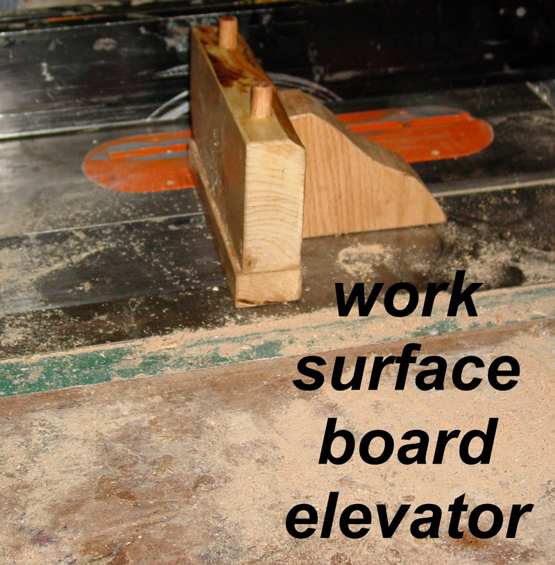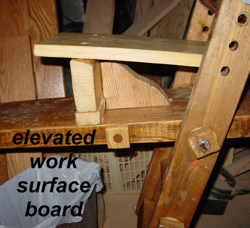 The work surface board is 1” x 7” x 30” long. It has 1” holes drilled on center through it on 2” centers in the far end. A one-inch wood dowel inserted and glued in on the far end of the horse holds the board in place at various settings. A piece of wood 2” deep by around 4” high by 8” wide elevates the board. There are two 1/2" dowels glued into the 2” top side of this elevator with corresponding holes in the board. A wood gusset was placed on its back side for stability. A comfortable angle for the work surface board should have it pointing to about the height of the belly button.