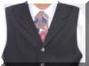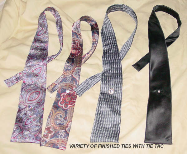 Take the tie and tie it the way you want to wear it. I have the outer wide part of the tie hag down around 11 inches or so. The narrow tail part or back side of the tie is then cut off so it doesn’t show, stitched up, then fold the point of the tie up behind and sew it in place. This gives the tie a square cut and a wide appearance at the knot. I pass the tie over the knot to get as wide a look as possible. I hook a small safety pin between the narrow tail of the tie to the back side of the front to keep the knot in place.